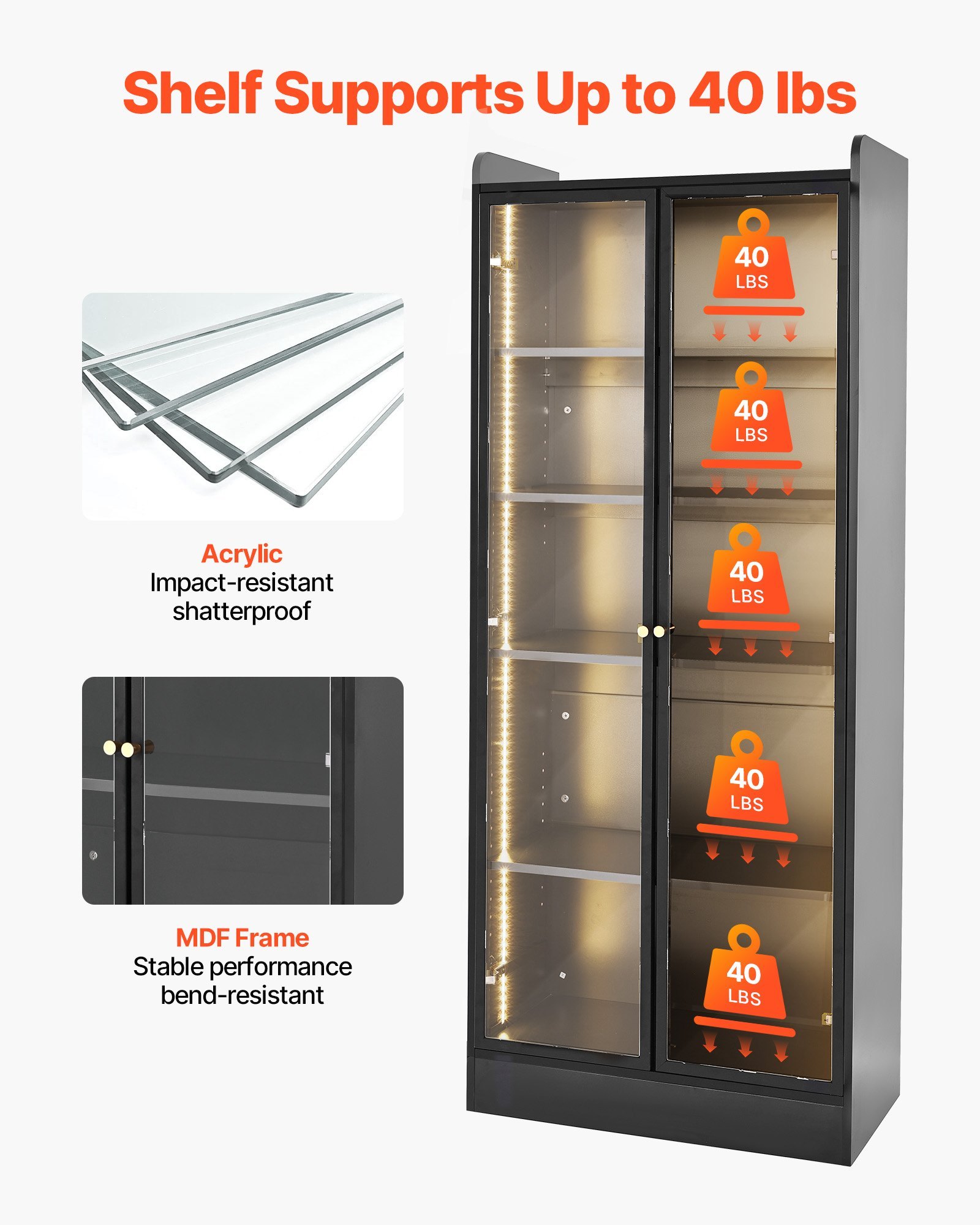 Sturdy and Durable: Made of thick density fiberboard and acrylic doors, this display cabinet with anti-tip bracket prevents shaking, warping, and collapse. Each shelf supports up to 40 libras. Finished with PVC edge banding and melamine veneer, it’s moisture-resistant and won’t peel—ideal for long-term collectibles display