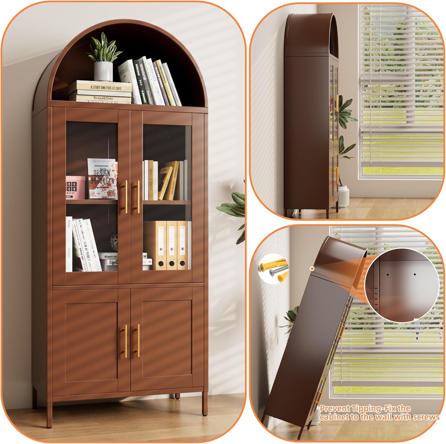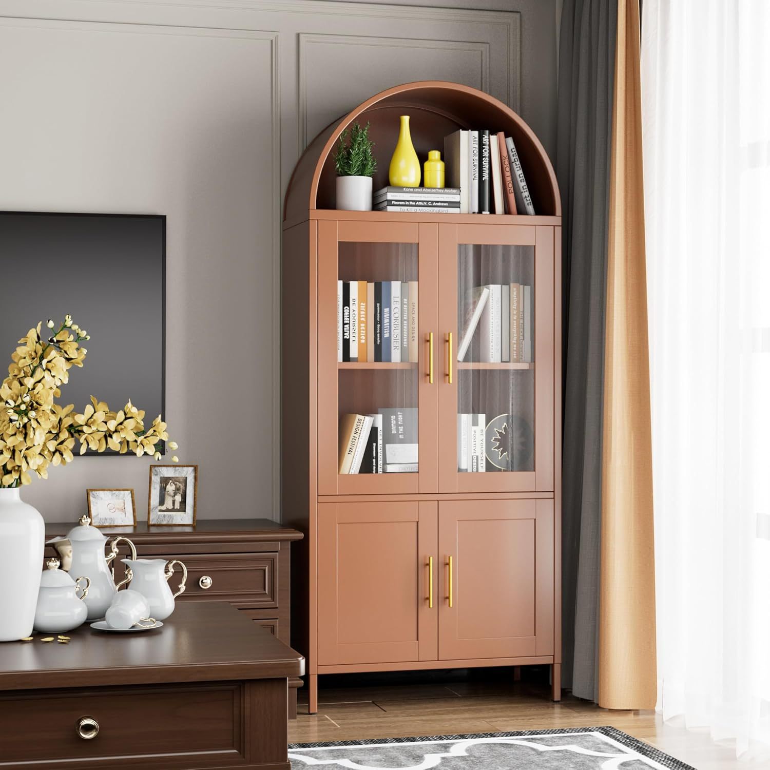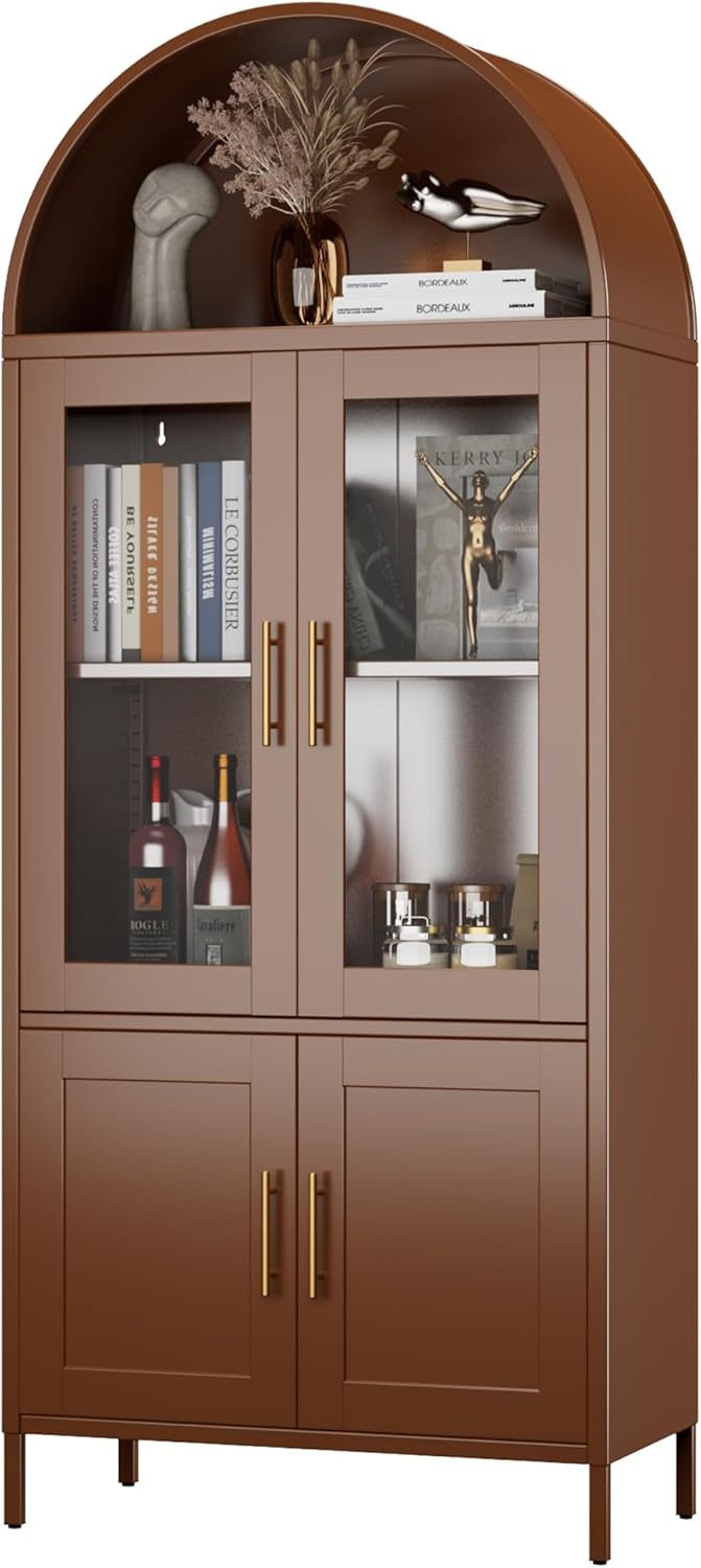 - Stylish Arch Design – Arched bookcase cabinet is a beautiful blend of design and functionality. Its gracefully curved silhouette makes it a statement piece that adds modern elegance to your home office. With two glass doors, it showcases your china or treasured possessions. This tall arched cabinet is both stylish and practical, making it an ideal addition to any room.