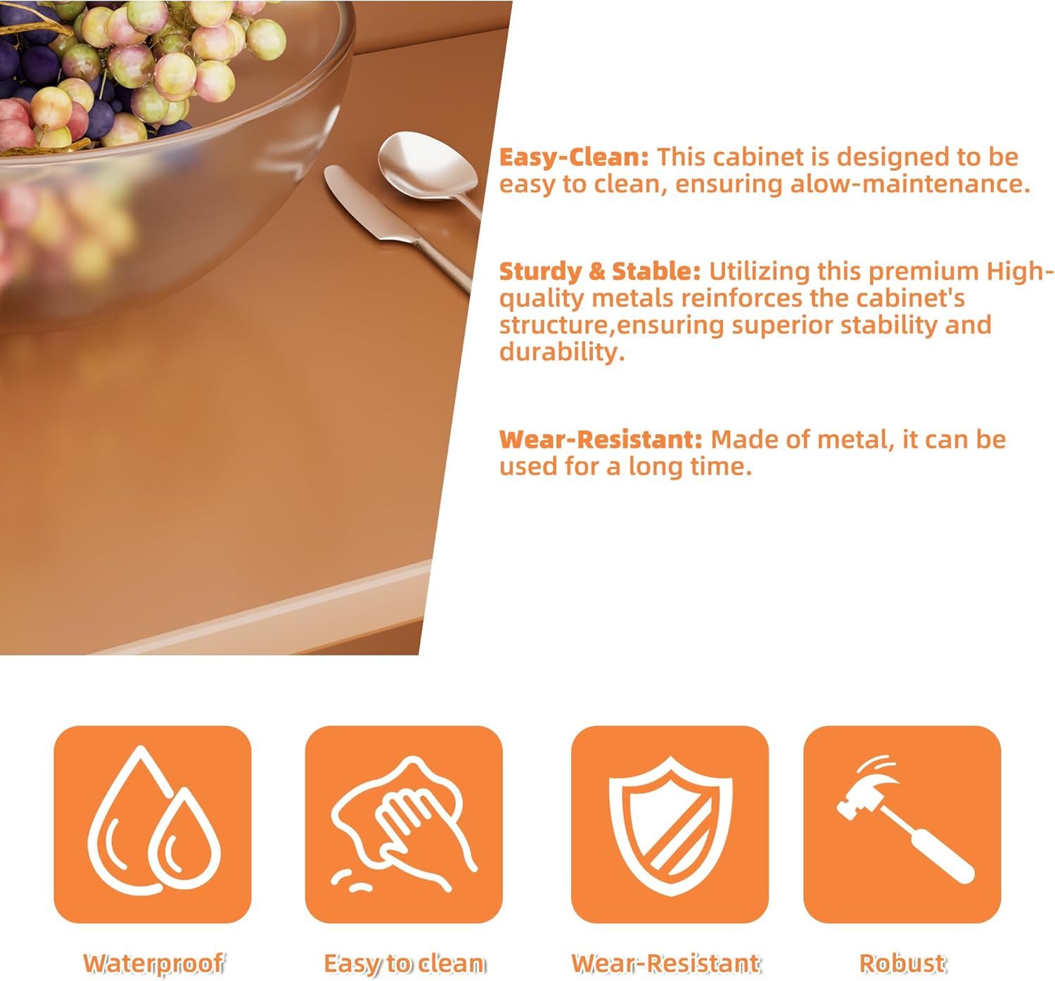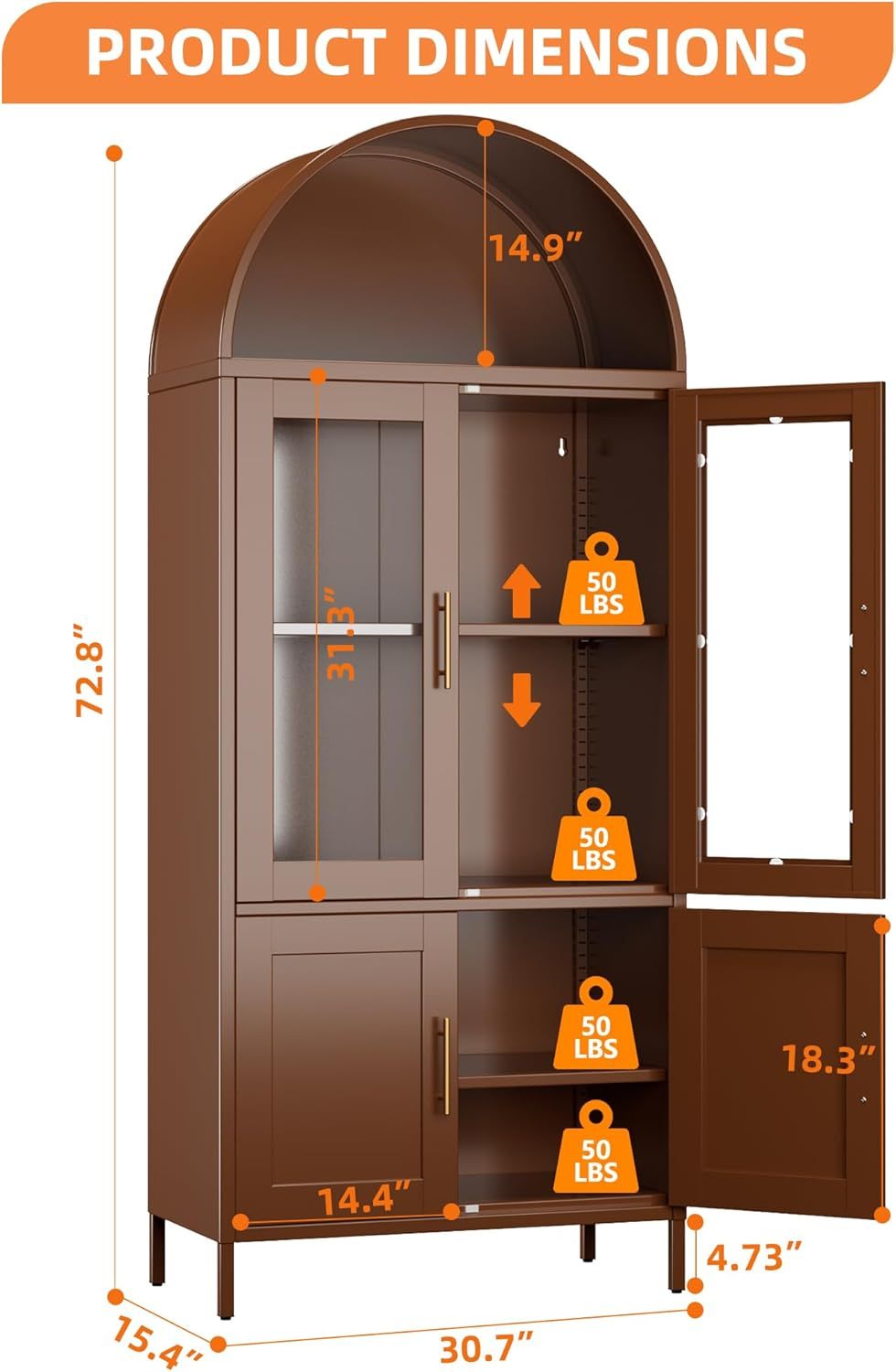 - Durable Metal Material – The arched display cabinet with doors is constructed from high-density steel, making it significantly stronger than wooden cabinets. Additionally, it is easier to clean and maintain. This arched cabinet with shelves provides efficient storage for all your kitchen essentials, from groceries to cookware.